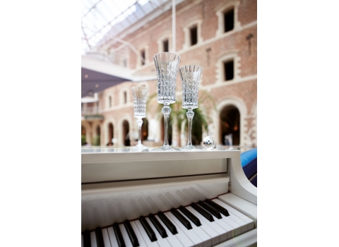 Sculpté en verre cristallin, brillant et transparent. Un son pur et clair d'une grande solidité. Cette collection puise son éclat sublime dans la profondeur et la multiplicité des facettes verticales et dans le mouvement des moulures qui drapent les verres.